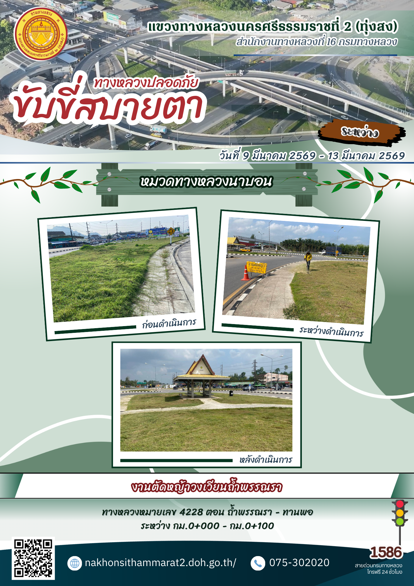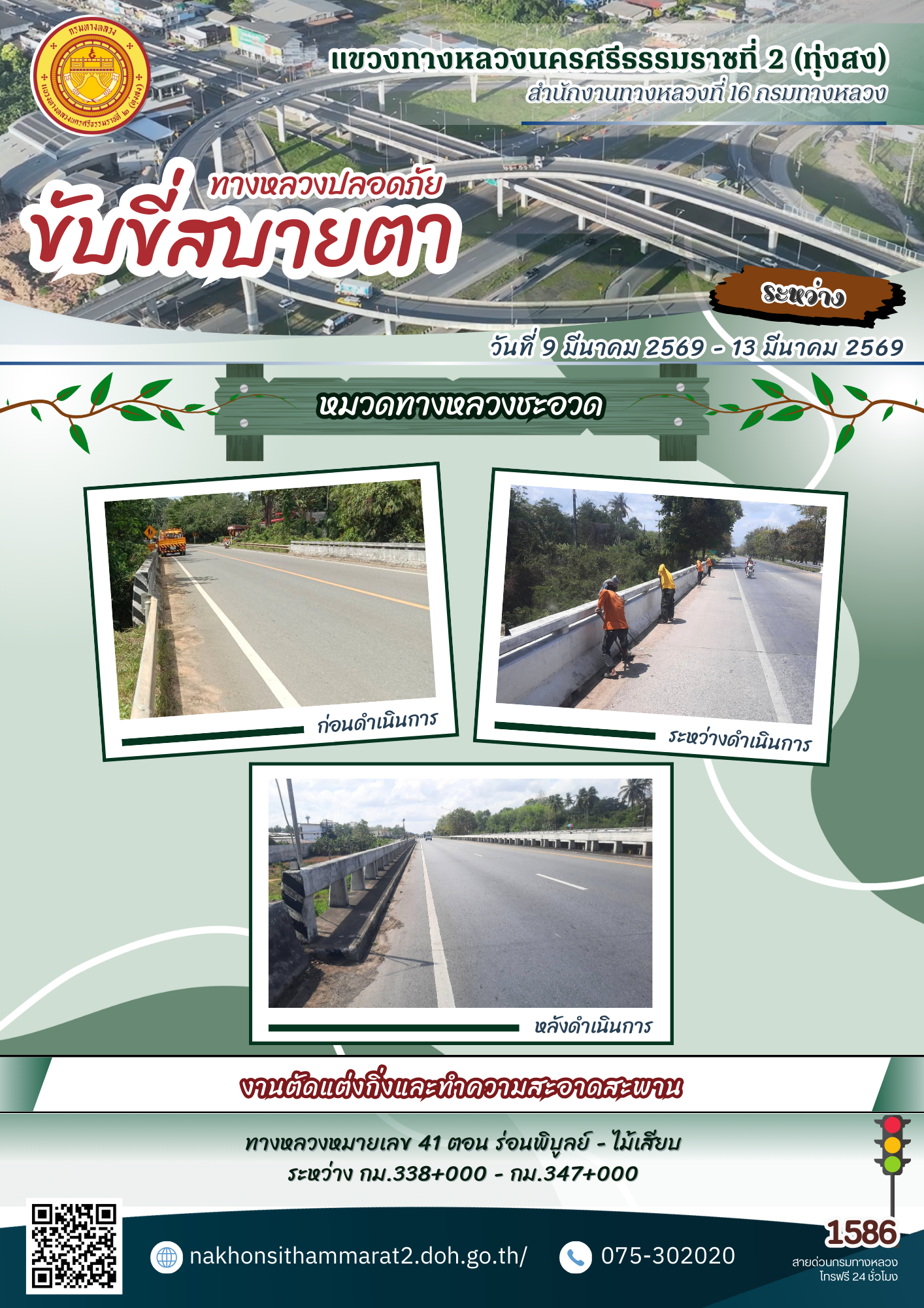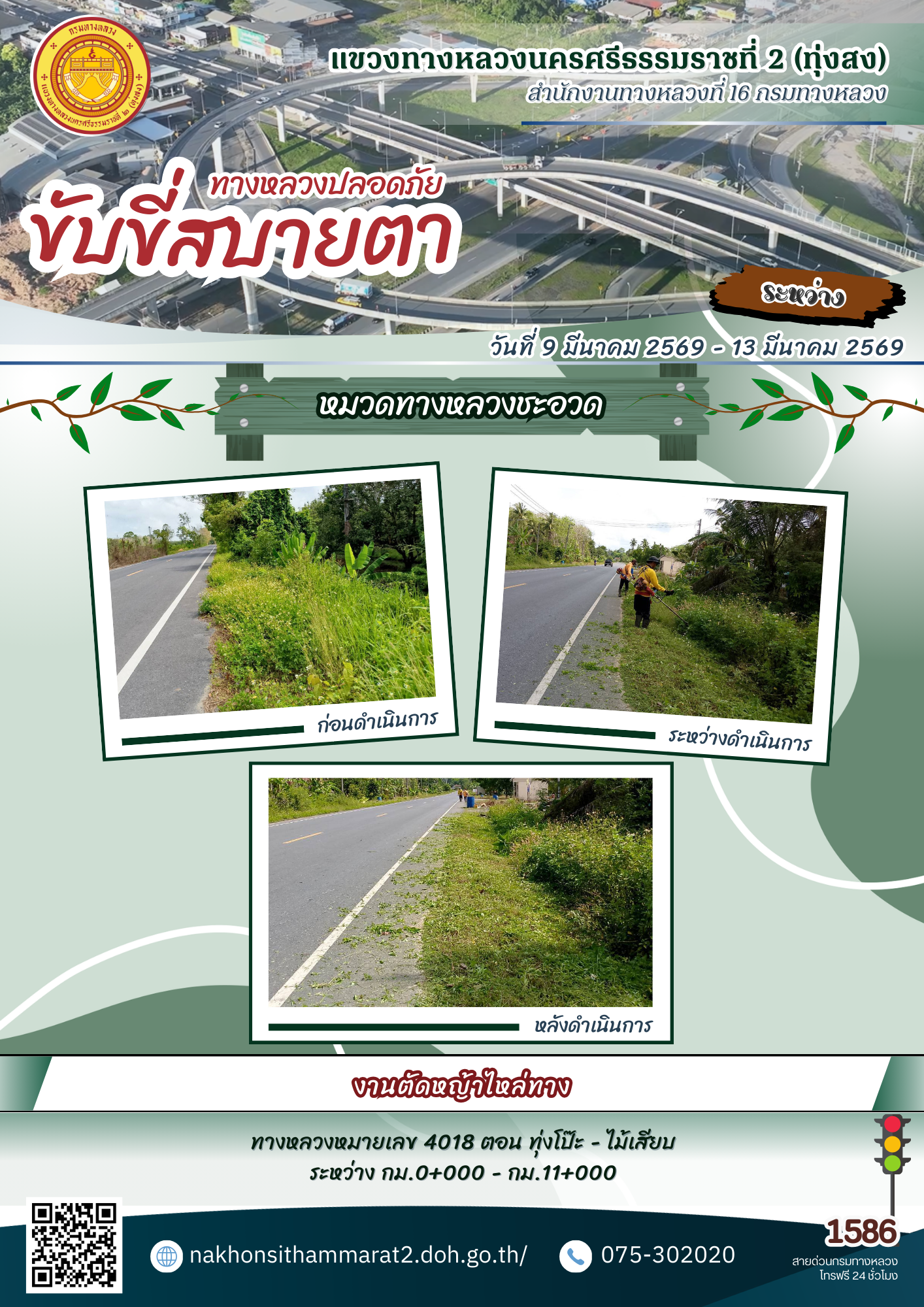 ผลการปฏิบัติงานของหมวดทางหลวงและหน่วยงานในสังกัด แขวงทางหลวงนครศรีธรรมราชที่ 2 (ทุ่งสง) ระหว่างวันที่ 9-13 มีนาคม 2569