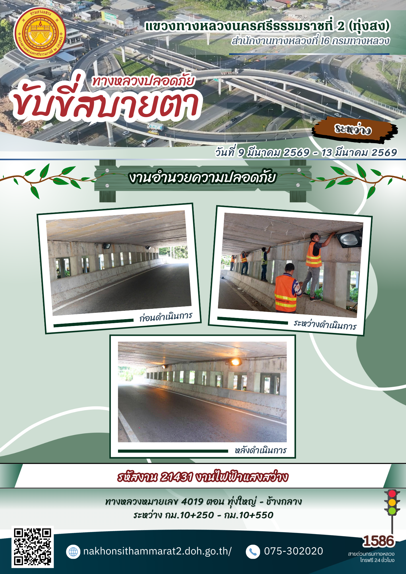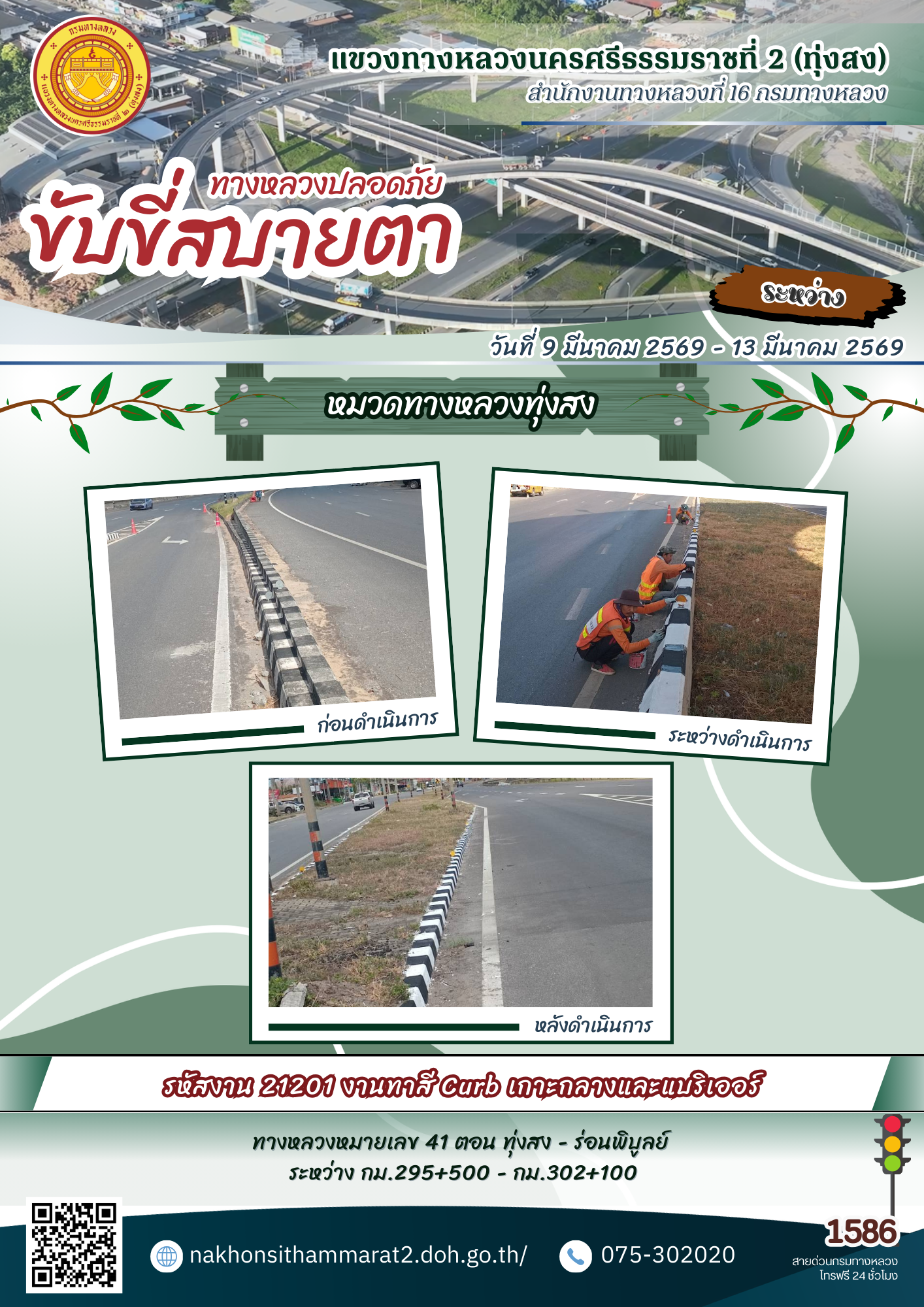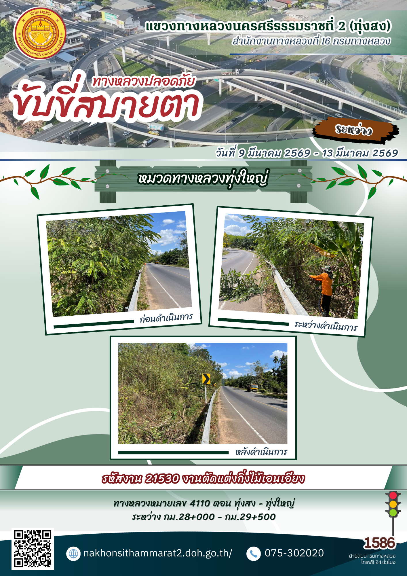 ผลการปฏิบัติงานของหมวดทางหลวงและหน่วยงานในสังกัด แขวงทางหลวงนครศรีธรรมราชที่ 2 (ทุ่งสง) ระหว่างวันที่ 9-13 มีนาคม 2569