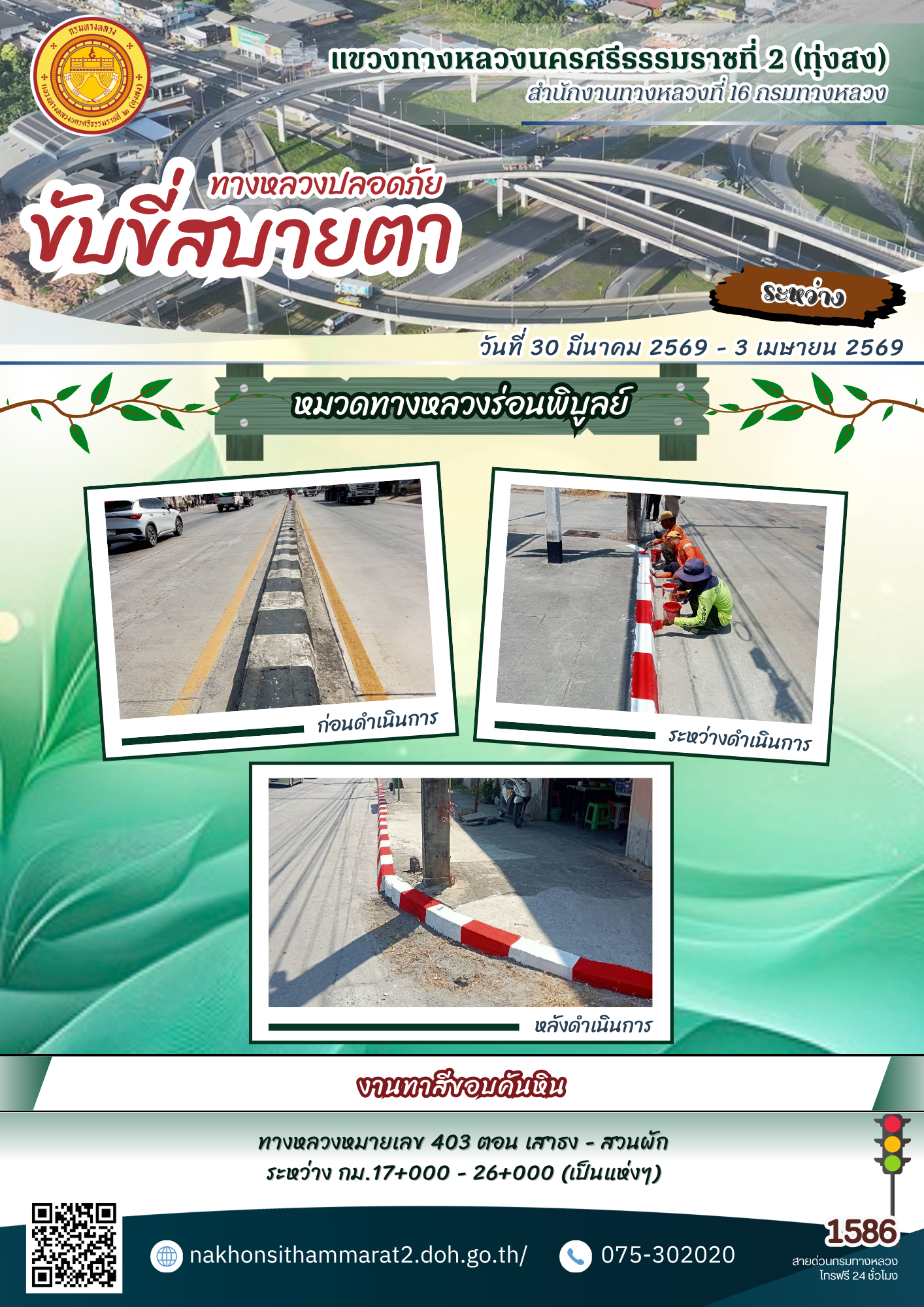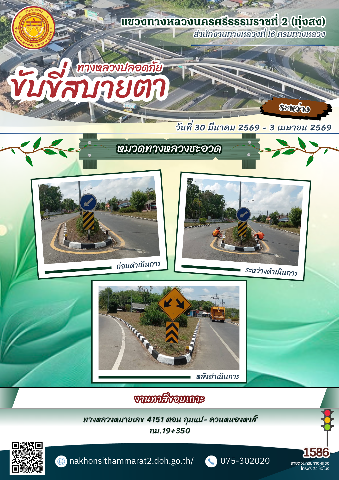 ผลการปฏิบัติงานของหมวดทางหลวงและหน่วยงานในสังกัด แขวงทางหลวงนครศรีธรรมราชที่ 2 (ทุ่งสง) ระหว่างวันที่ 30 มีนาคม - 3 เมษายน พ.ศ.2569