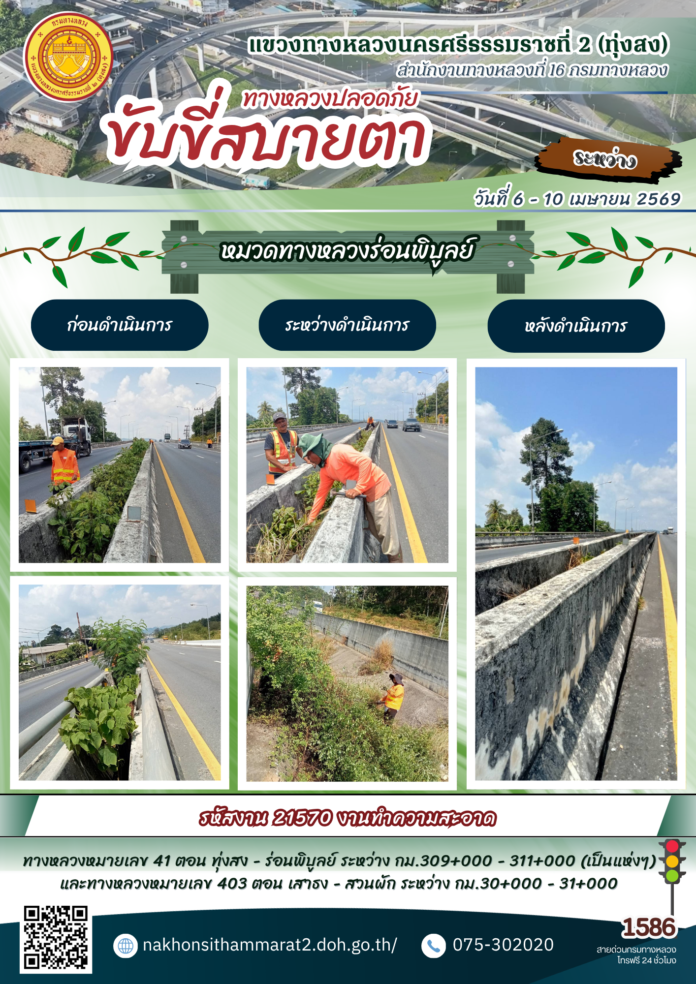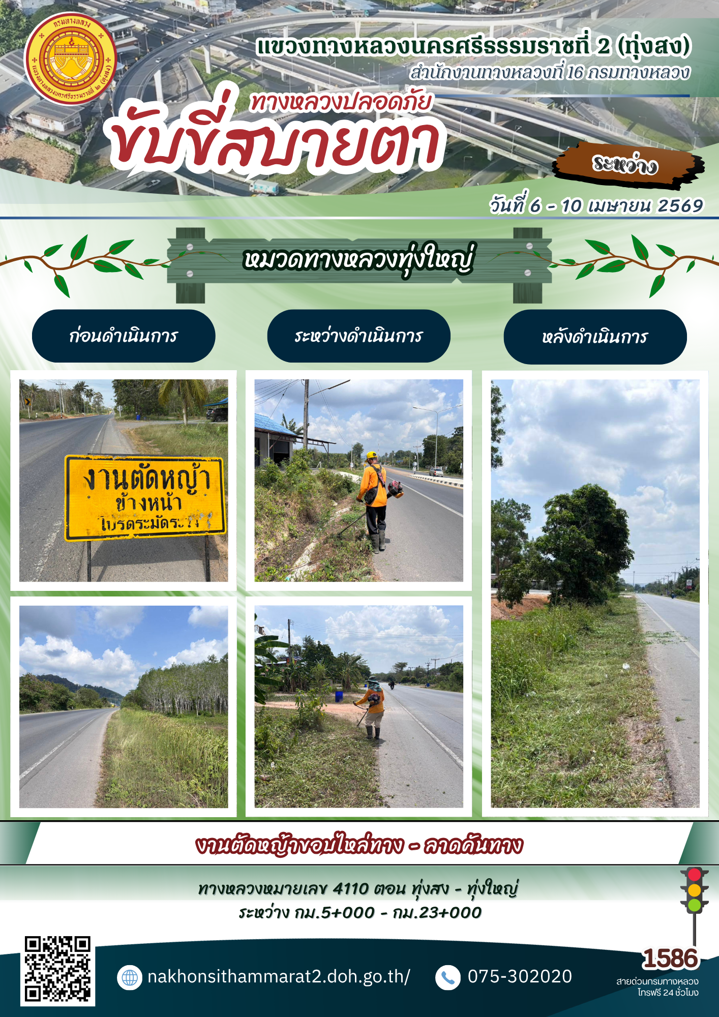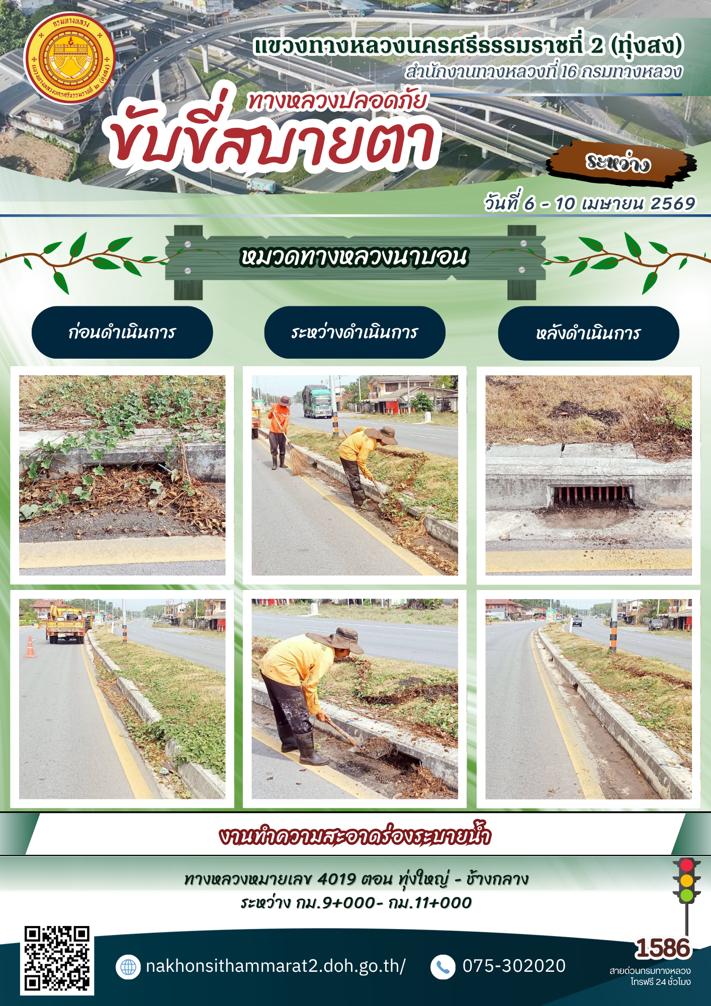ผลการปฏิบัติงานของหมวดทางหลวงและหน่วยงานในสังกัด แขวงทางหลวงนครศรีธรรมราชที่ 2 (ทุ่งสง) ระหว่างวันที่ 6 - 10 เมษายน พ.ศ.2569