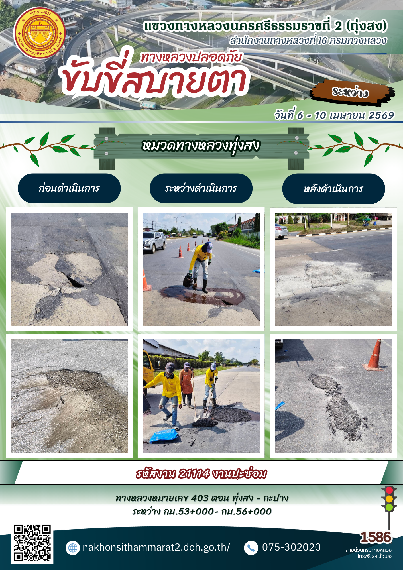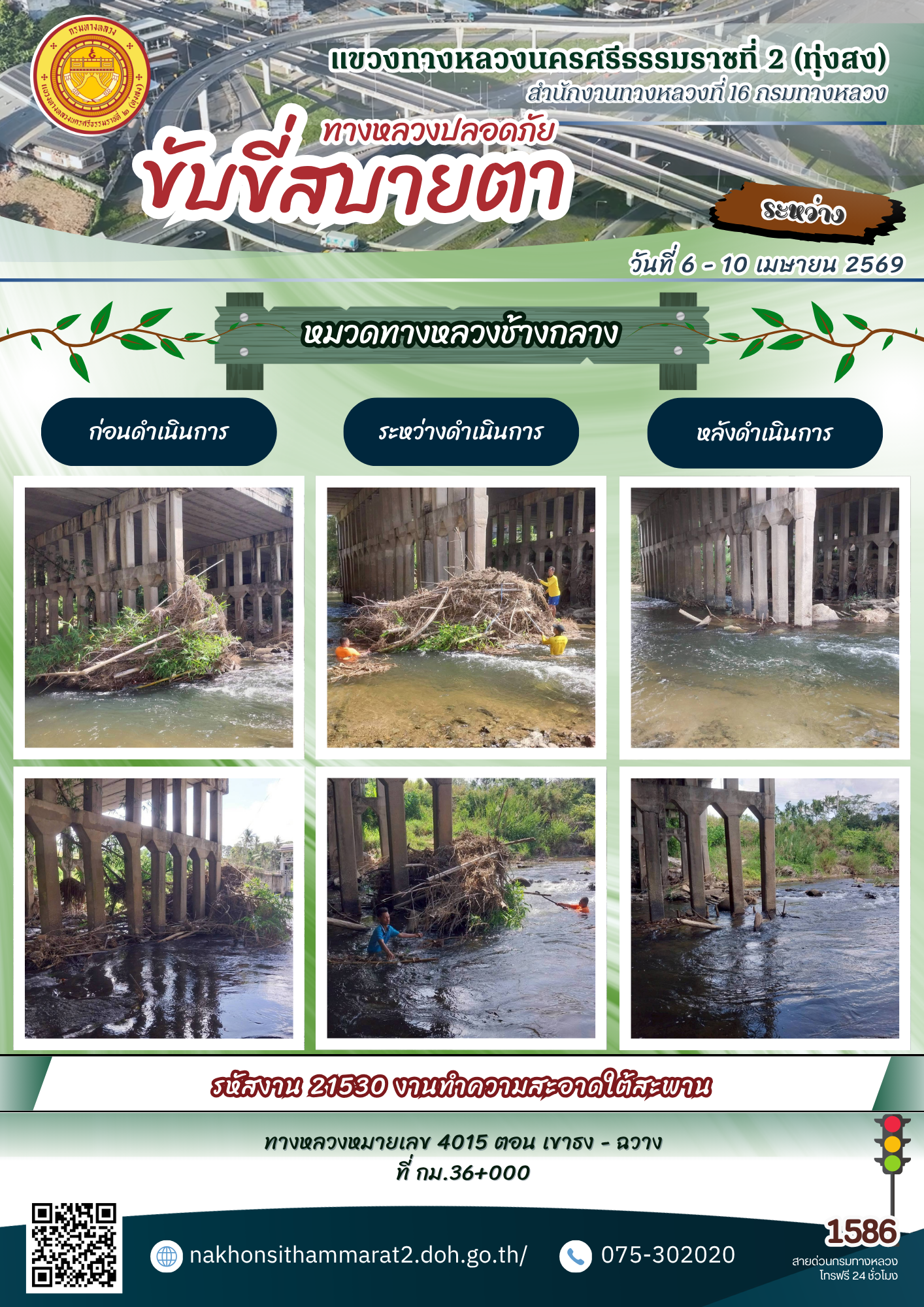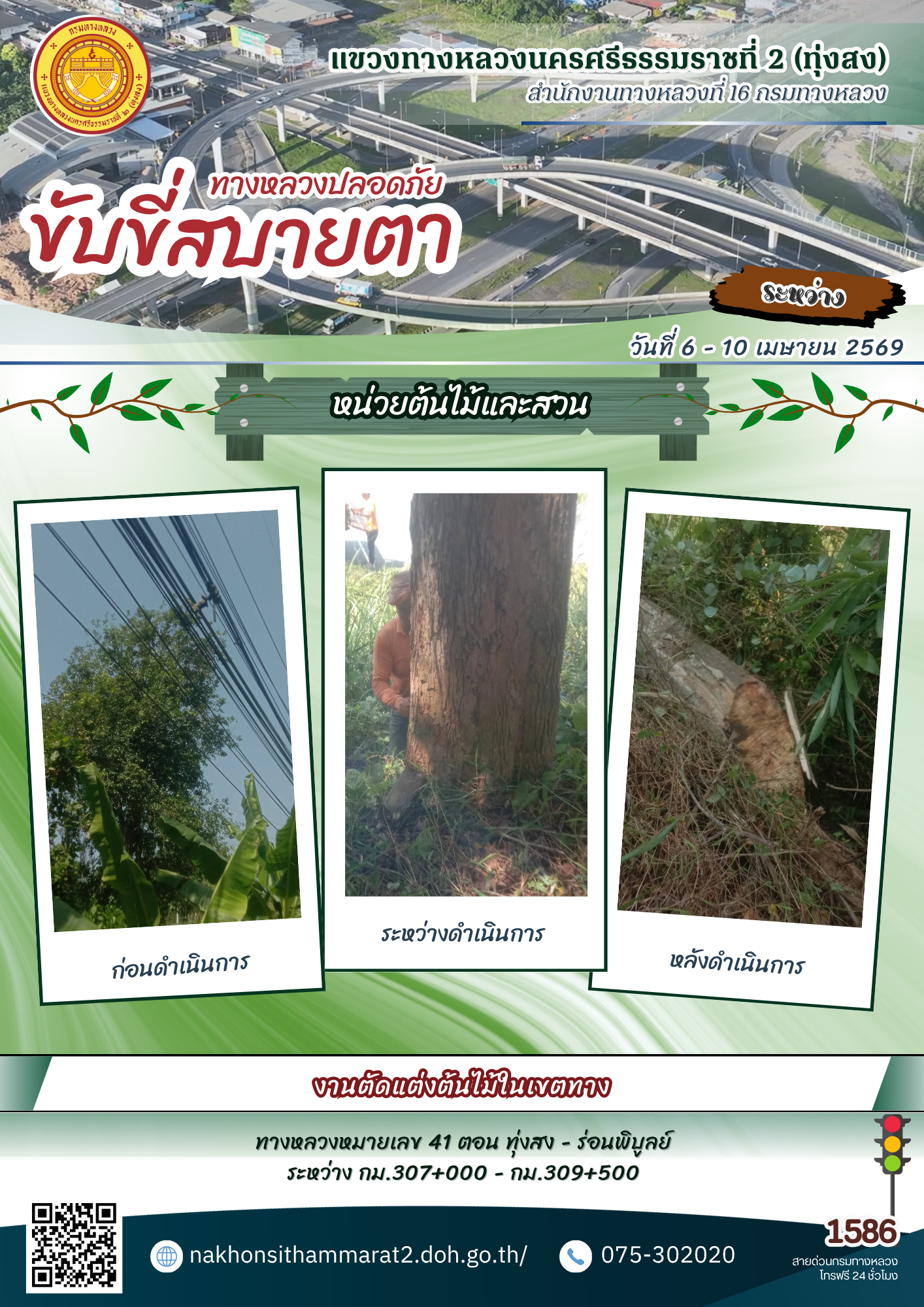 ผลการปฏิบัติงานของหมวดทางหลวงและหน่วยงานในสังกัด แขวงทางหลวงนครศรีธรรมราชที่ 2 (ทุ่งสง) ระหว่างวันที่ 6 - 10 เมษายน พ.ศ.2569
