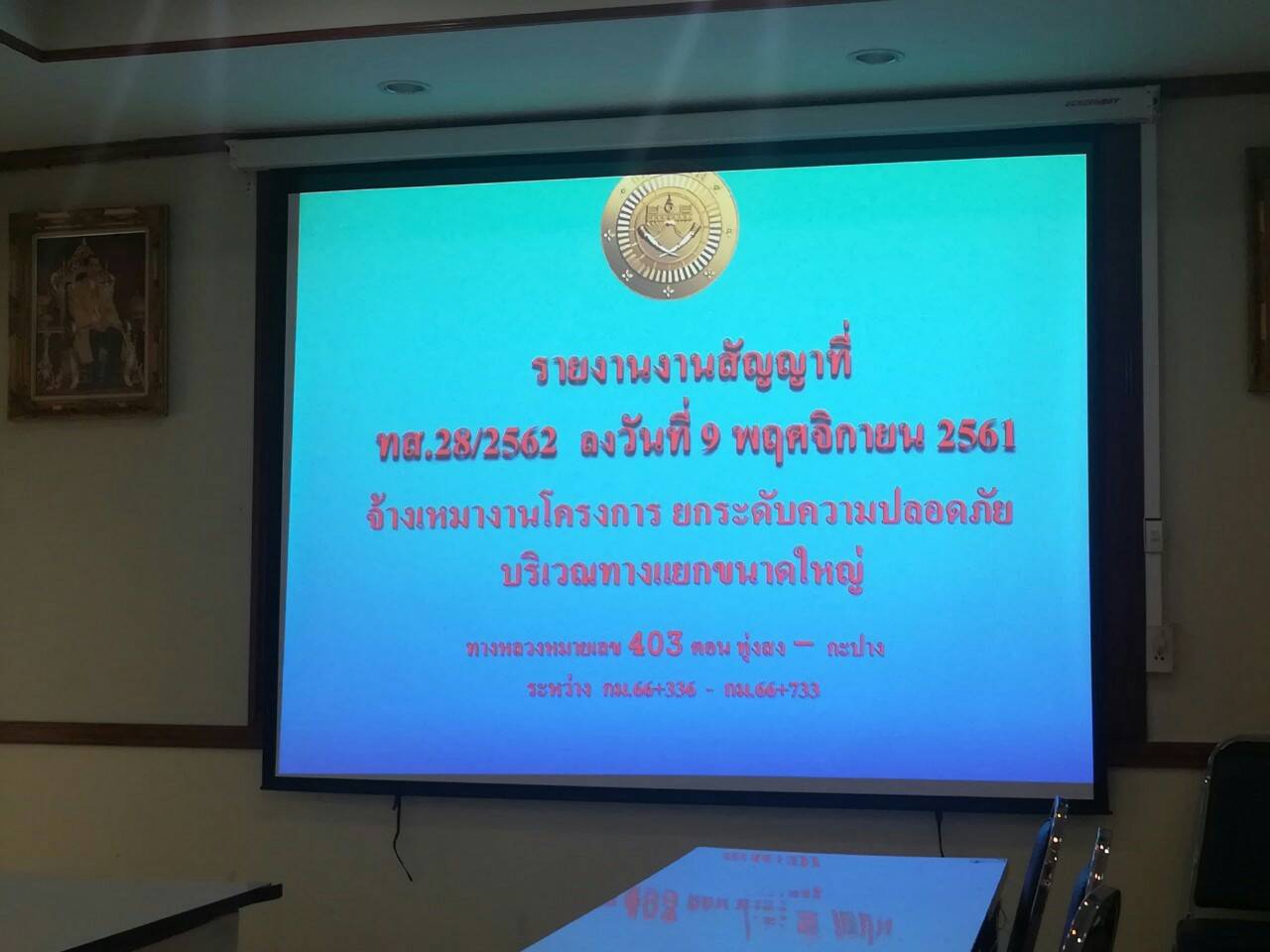 วันพุธ ที่ 3 เมษายน 2562 นายจิรวัฒน์ ทรงผาสุก รองผู้อำนวยการสำนักงานทางหลวงที่16 ประธานคณะกรรมการตรวจรับพัสดุ และคณะกรรมการ ตรวจรับงานสัญญา ทส.27/2562 โครงการยกระดับความปลอดภัยบริเวณทางแยกขนาดใหญ่ ในทางหลวงหมายเลข 403 ตอน ทุ่งสง - จำปา ระหว่าง กม.66+336 - กม.66+733 ณ ห้องประชุม 2 แขวงทางหลวงนครศรีธรรมราชที่ 2 (ทุ่งสง)