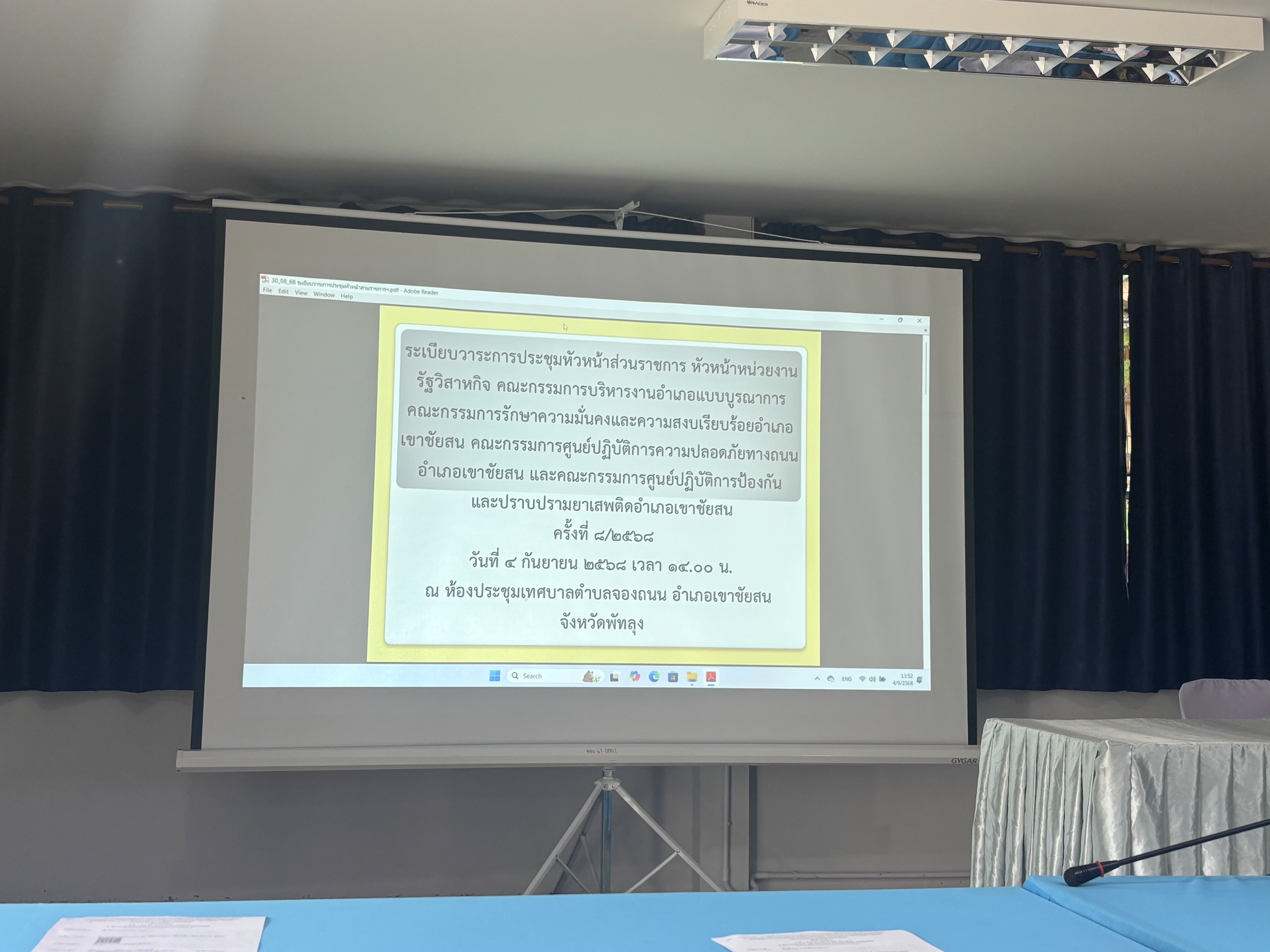 ข้อมูลภาพกิจกรรม : ในวันที่ 4 กันยายน 256 นายณัฐชนน จันทร์คง ผู้อำนวยการแขวงทางหลวงพัทลุง มอบหมายให้ นายราเชน อุยโยชะกะ นายช่างโยธาชำนาญงาน นายภคิน เชื้อช่วยชู นายช่างโยธาปฏิบัติงาน และเจ้าหน้าที่ที่เกี่ยวข้อง ร่วมประชุมหัวหน้าส่วนราชการ หัวหน้าหน่วนงานรัฐวิสาหกิจ คณะกรรมการบริหารงานอำเภอแบบบูรณาการ คณะกรรมการรักษาความมั่นคงและความสงบเรียบร้อยอำเภอเขาชัยสน คณะกรรมการศูนย์ปฏิบัติการความปลอดภัยทางถนนอำเภอเขาชัยสน คณะกรรมการศูนย์ปฏิบัติการป้องกันและปราบปรามยาเสพติดอำเภอเขาชัยสน ครั้งที่ 8/2568