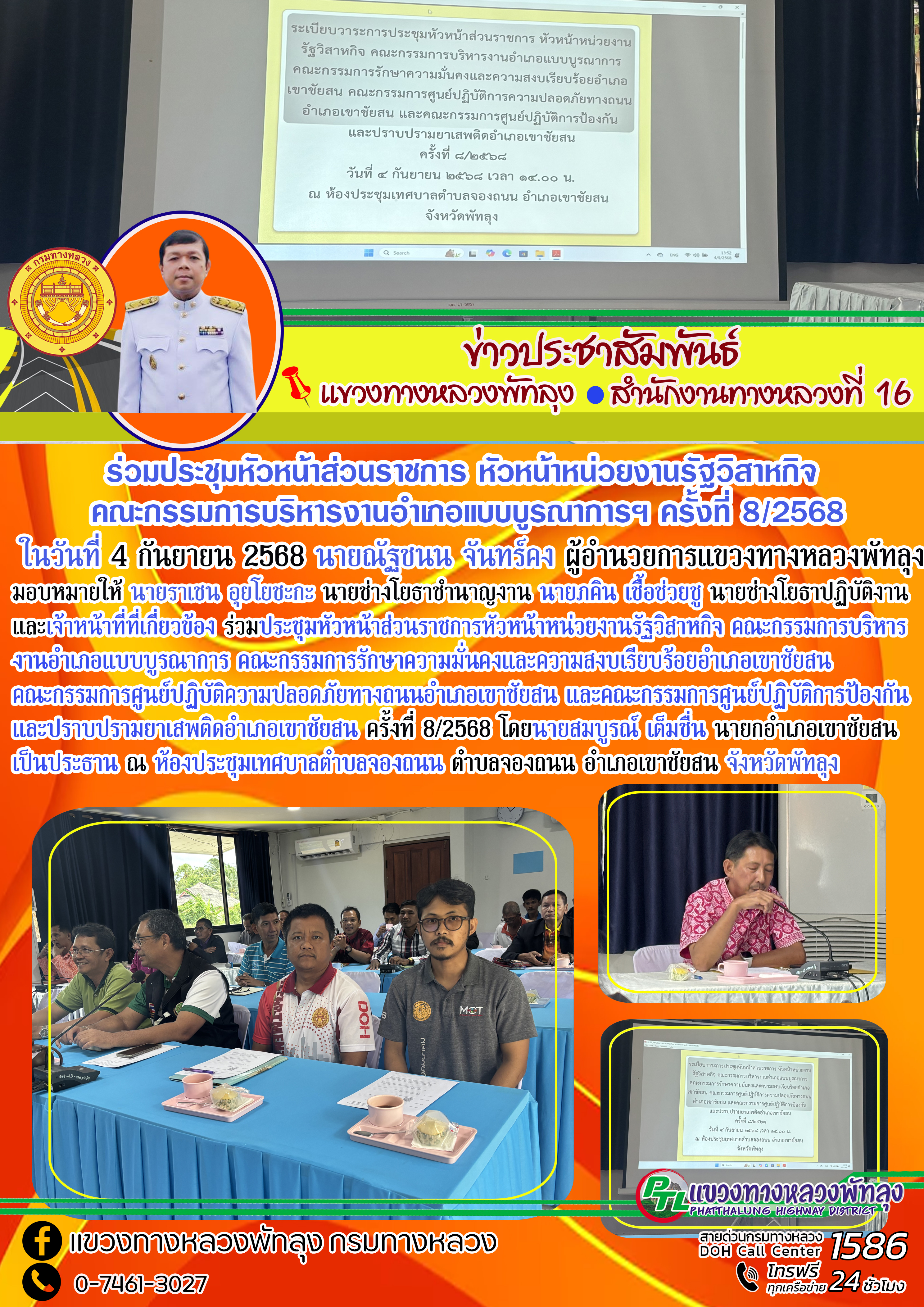 ในวันที่ 4 กันยายน 256 นายณัฐชนน จันทร์คง ผู้อำนวยการแขวงทางหลวงพัทลุง มอบหมายให้ นายราเชน อุยโยชะกะ นายช่างโยธาชำนาญงาน นายภคิน เชื้อช่วยชู นายช่างโยธาปฏิบัติงาน และเจ้าหน้าที่ที่เกี่ยวข้อง ร่วมประชุมหัวหน้าส่วนราชการ หัวหน้าหน่วนงานรัฐวิสาหกิจ คณะกรรมการบริหารงานอำเภอแบบบูรณาการ คณะกรรมการรักษาความมั่นคงและความสงบเรียบร้อยอำเภอเขาชัยสน คณะกรรมการศูนย์ปฏิบัติการความปลอดภัยทางถนนอำเภอเขาชัยสน คณะกรรมการศูนย์ปฏิบัติการป้องกันและปราบปรามยาเสพติดอำเภอเขาชัยสน ครั้งที่ 8/2568