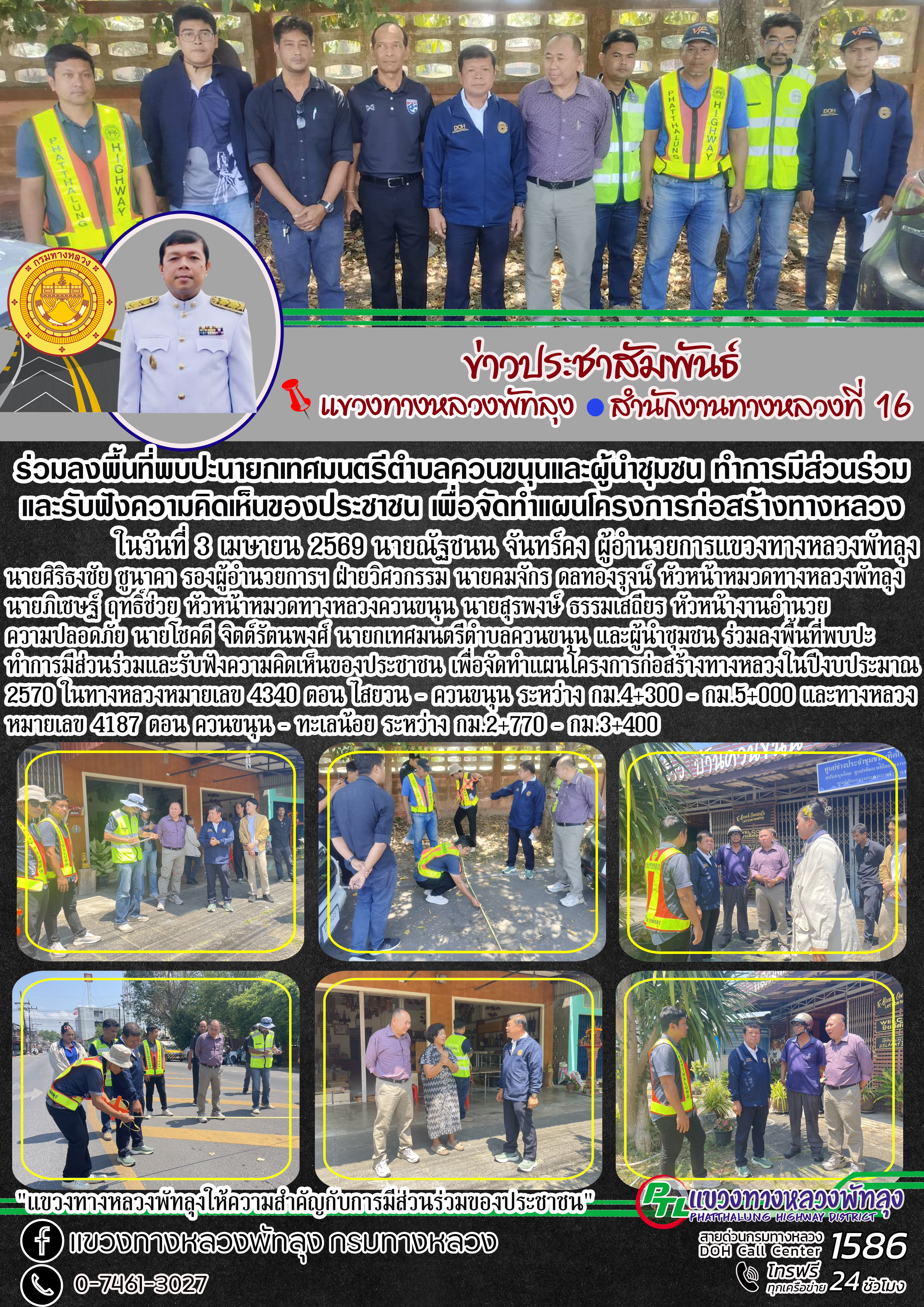 ในวันที่ 3 เมษายน 2569 นายณัฐชนน จันทร์คง ผู้อำนวยการแขวงทางหลวงพัทลุง นายศิริธงชัย ชูนาคา รองผู้อำนวยการฯ ฝ่ายวิศวกรรม นายคมจักร ดลทองรุจน์ หัวหน้าหมวดทางหลวงพัทลุง นายภิเชษฐ์ ฤทธิ์ช่วย หัวหน้าหมวดทางหลวงควนขนุน นายสุรพงษ์ ธรรมเสถียร หัวหน้างานอำนวยความปลอดภัย นายโชคดี จิตต์รัตนพงศ์ นายกเทศมนตรีตำบลควนขนุน และผู้นำชุมชน ร่วมลงพื้นที่พบปะ ทำการมีส่วนร่วมและรับฟังความคิดเห็นของประชาชน เพื่อจัดทำแผนโครงการก่อสร้างทางหลวงในปีงบประมาณ 2570 ในทางหลวงหมายเลข 4340 ตอน ไสยวน - ควนขนุน ระหว่าง กม.4+300 - กม.5+000 และทางหลวงหมายเลข 4187 ตอน ควนขนุน - ทะเลน้อย ระหว่าง กม.2+770 - กม.3+400