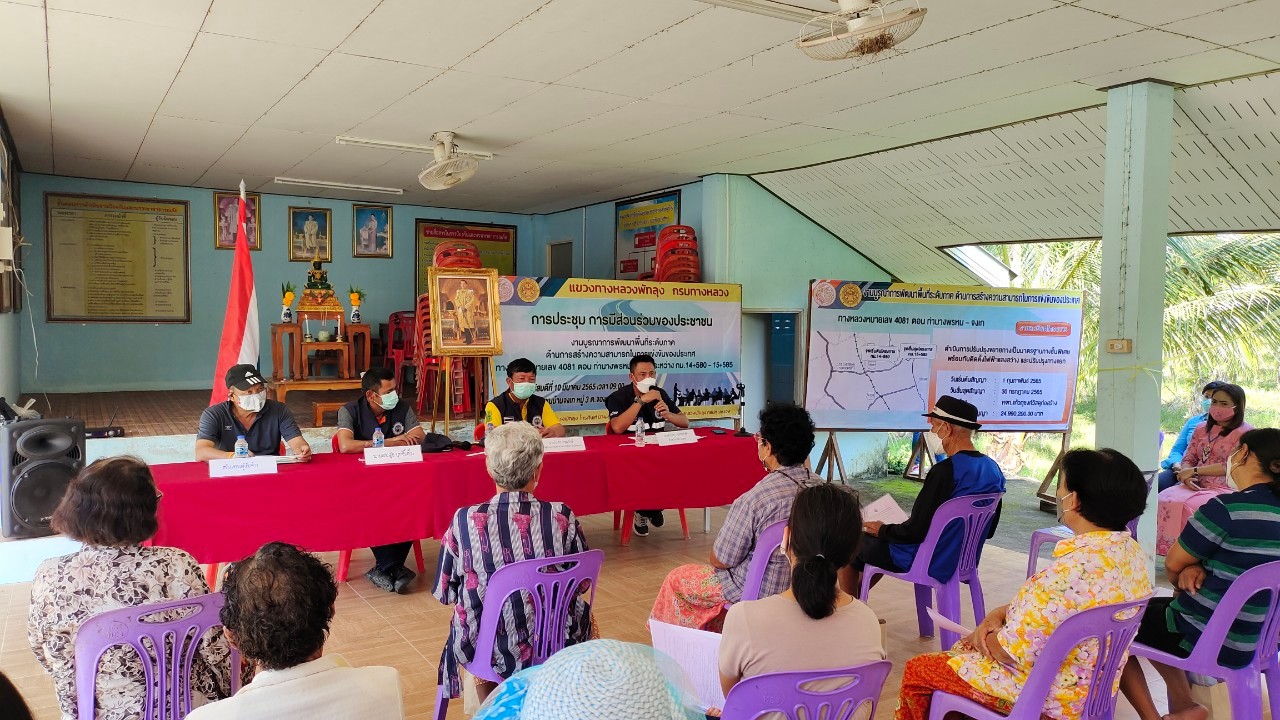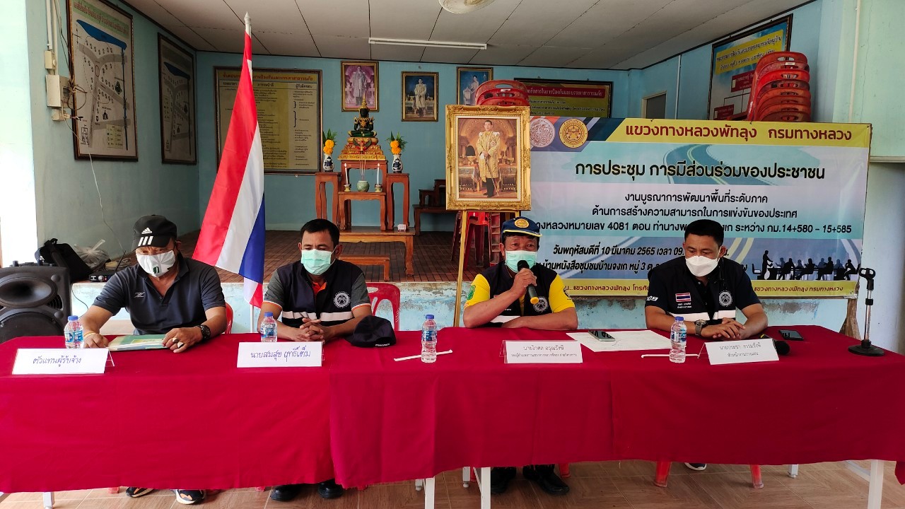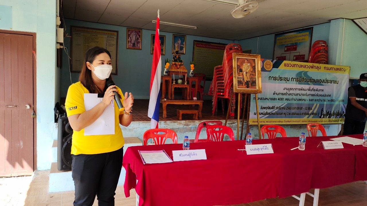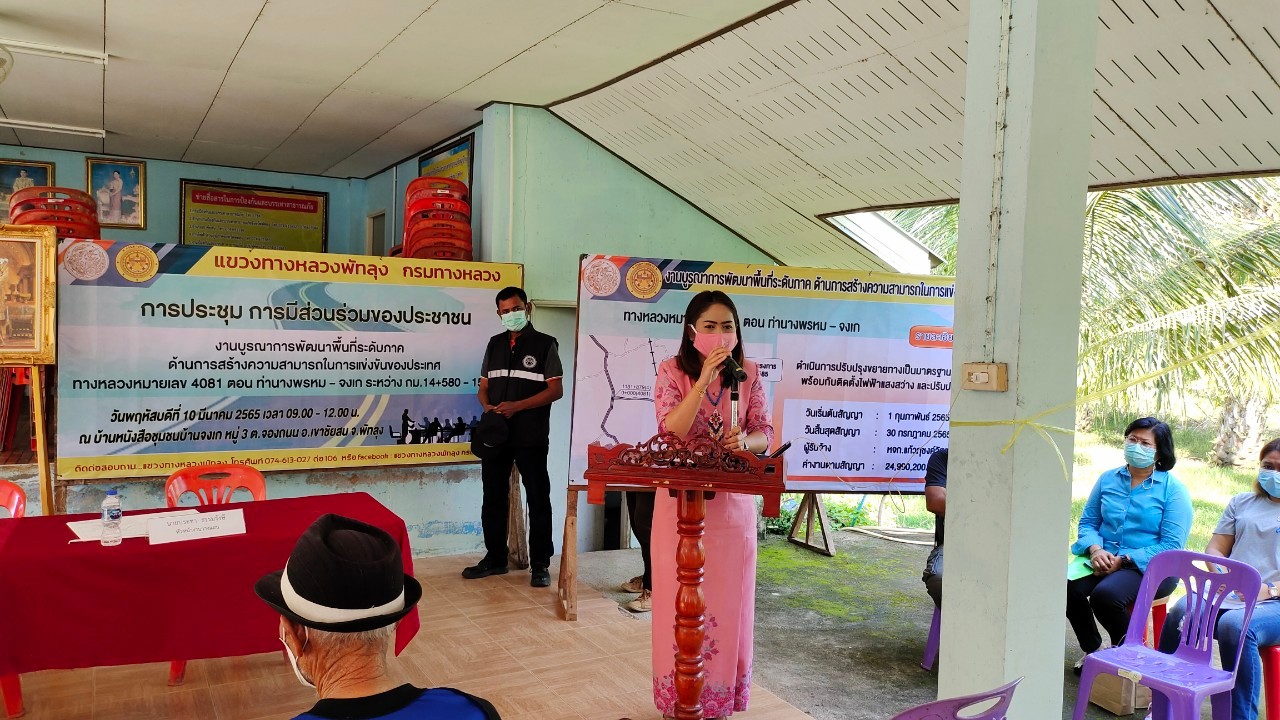 แขวงทางหลวงพัทลุง นำโดย นายคมกริช ตันตรัตนพงษ์ ผู้อำนวยการแขวงทางหลวงพัทลุง จัดการประชุมการมีส่วนร่วมของประชาชน งานบูรณาการพัฒนาพื้นที่ระดับภาคฯ ในวันที่ 10 มีนาคม 2565 ทางหลวงหมายเลข 4081 ตอน ท่านางพรหม - จงเก ระหว่าง กม.14+580 - 15+585 เพื่อแนะนำข้อมูล และรูปแบบการก่อสร้างให้ประชาชน ในพื้นที่ได้รับทราบ พร้อมทั้งรับฟังข้อเสนอแนะต่างๆ โดยมีผู้ควบคุมงานและตัวแทนผู้รับจ้าง เข้าร่วมประชุม ณ บ้านหนังสือชุมชนบ้านจงเก ต.บ้านจองถนน อ.เขาชัยสน จ.พัทลุง