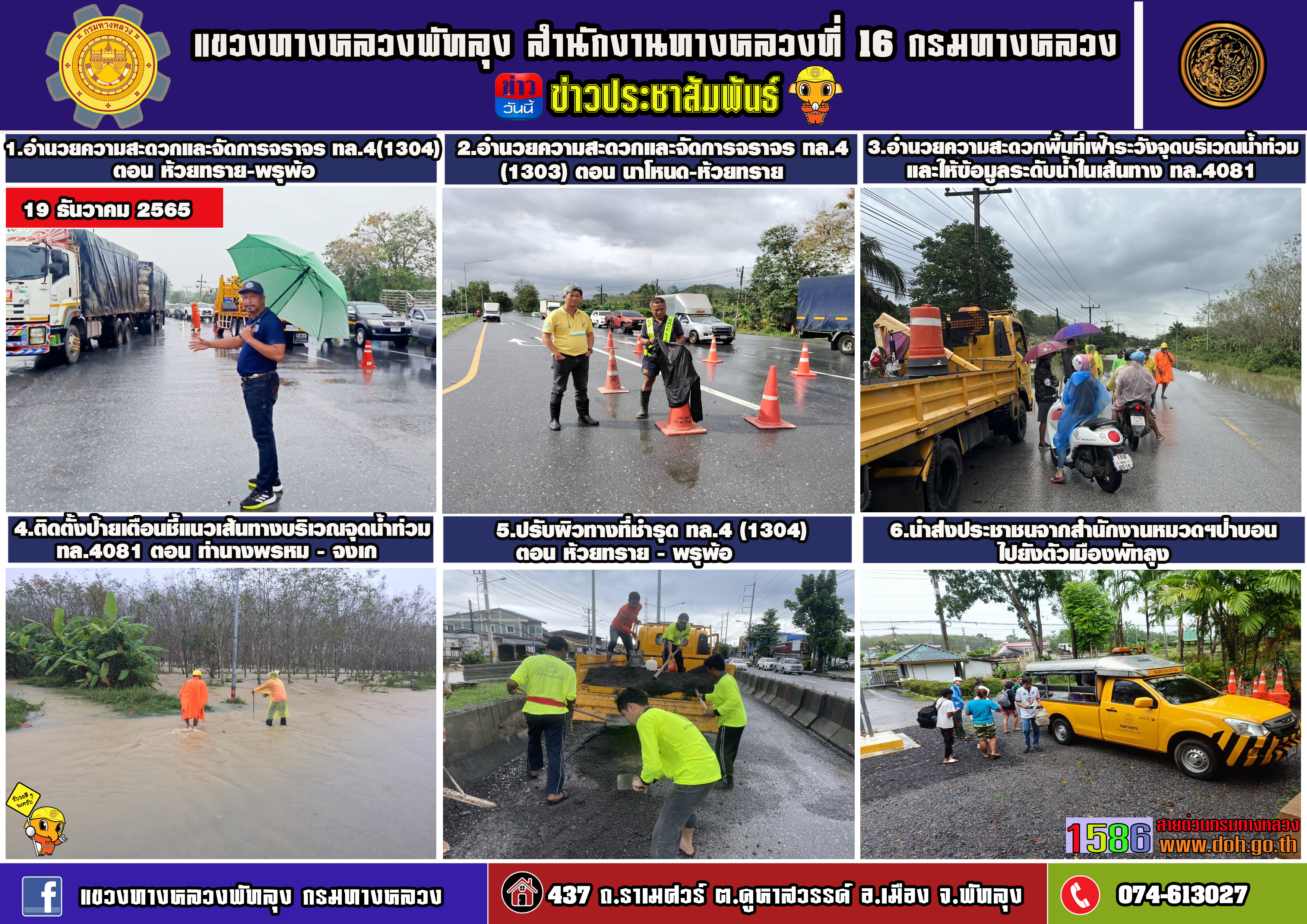 ในวันที่ 19 ธันวาคม 2565 นายไพจิตร แสงทอง ผู้อำนวยการสำนักงานทางหลวงที่ 16 พร้อมด้วย นายคมกริช ตันตรัตนพงษ์ ผู้อำนวยการแขวงทางหลวงพัทลุง และเจ้าหน้าที่แขวงฯพัทลุง ได้มีการช่วยเหลือประชาชนจากเหตุน้ำท่วมทาง