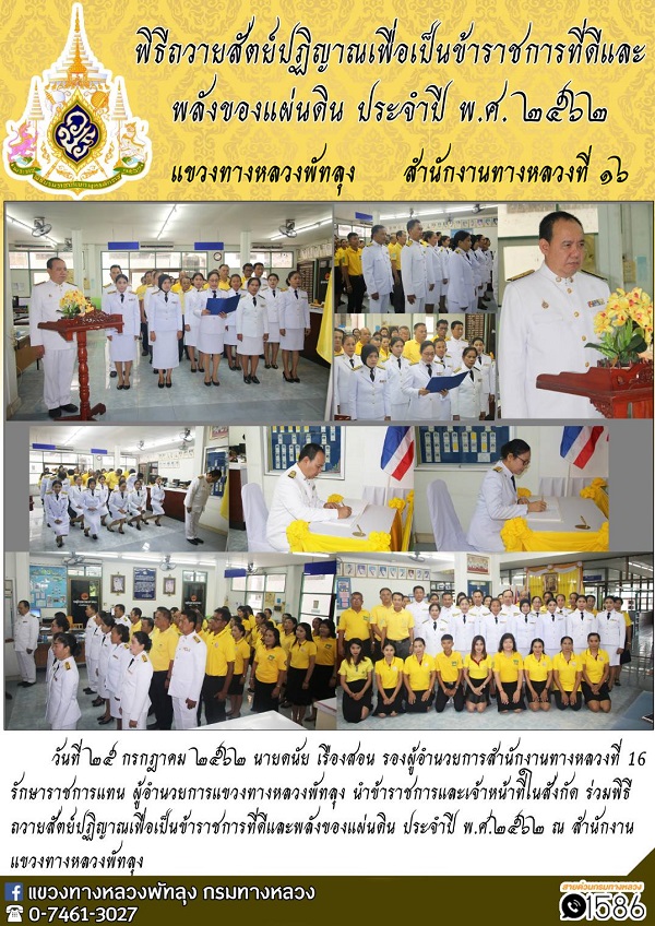 25 กรกฎาคม 2562 นายดนัย เรืองสอน นำทีมข้าราชการ,ลูกจ้างและเจ้าหน้าที่แขวงทางหลวงพัทลุง เข้วร่วมพิธีถวายสัตย์ปฏิญาณ เพื่อเป็นข้าราชการที่ดีและพลังของแผ่นดิน ประจำปี 2562 เบื้องหน้าพระบรมฉายาลักษณ์ พระบาทสมเด็จพระปรเมนทรรามาธิบดีศรีสินทรมหาวชิราลงกรณฯ พระวชิรเกล้าเจ้าอยู่หัว พร้อมทั้งร่วมกันร้องเพลงสรรเสริญพระบารมี และเพลงสดุดีจอมราชา ณ ที่สำนักงานแขวงทางหลวงพัทลุง