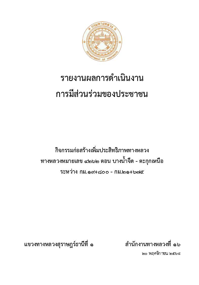 รายงานผลการดำเนินงาน การมีส่วนร่วมของประชาชน กิจกรรมก่อสร้างเพิ่มประสิทธิภาพทางหลวง ทางหลวงหมายเลข 4114 ตอน สมอทอง -ชายทะเล ระหว่าง กม.2+820 - กม.3+720
