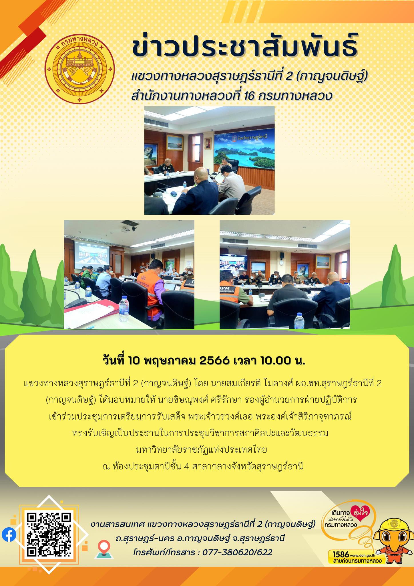 แขวงทางหลวงสุราษฎร์ธานีที่ 2 (กาญจนดิษฐ์) โดย นายสมเกียรติ โมควงศ์ ผอ.ขท.สุราษฎร์ธานีที่ 2 (กาญจนดิษฐ์) ได้มอบหมายให้ นายชิษณุพงศ์ ศรีรักษา รองผู้อำนวยการฝ่ายปฏิบัติการเข้าร่วมประชุมการเตรียมการรับเสด็จ พระเจ้าวรวงค์เธอ พระองค์เจ้าสิริภาจุฑาภรณ์ ทรงรับเชิญเป็นประธานในการประชุมวิชาการสภาศิลปะและวัฒนธรรม มหาวิทยาลัยราชภัฏแห่งประเทศไทย ณ ห้องประชุมตาปีชั้น 4 ศาลากลางจังหวัดสุราษฎร์ธานี