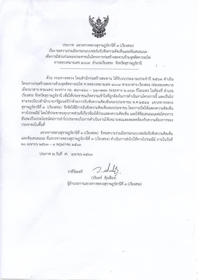 การมีส่วนร่วมของประชาชน โครงการก่อสร้างสะพานข้ามจุดตัดทางรถไฟ ทางหลวงหมายเลข 4009 ระหว่าง กม.59+410-กม.61+773 ในท้องที่ อำเภอเวียงสระ จังหวัดสุราษฎร์ธานี ระยะทาง 2.363 กิโลเมตร