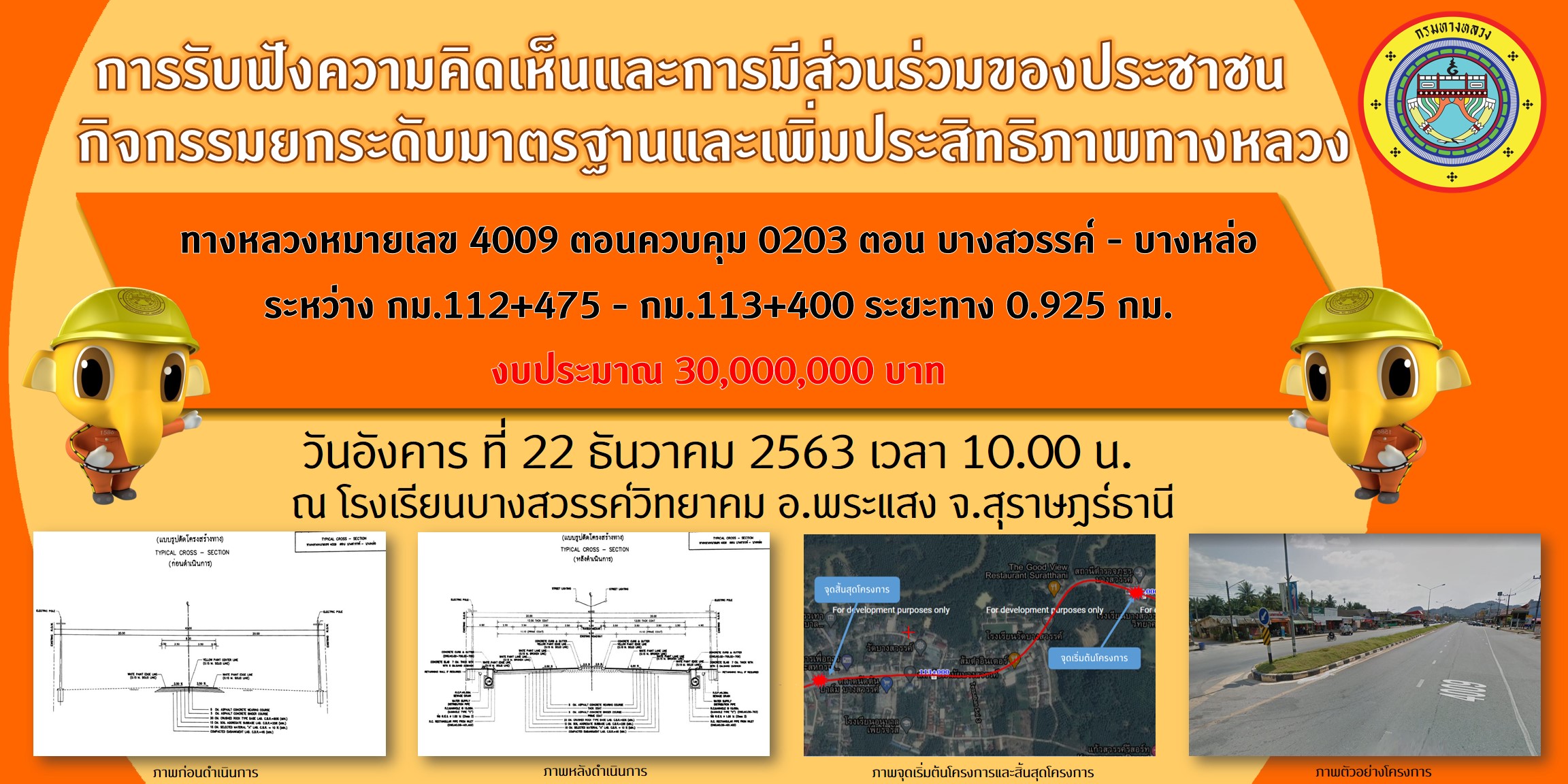ขอเชิญชวนชาวอำเภอพระแสง จังหวัดสุราษฏร์ธานี และ ผู้สนใจ ร่วมรับฟังข้อมูลและแสดงความคิดเห็น กิจกรรมยกระดับมาตรฐานและเพิ่มประสิทธิภาพทางหลวง ในทางหลวงหมายเลข 4009 ตอน บางสวรรค์ - บางหล่อ ระหว่าง กม.112+475 – กม. 113+400