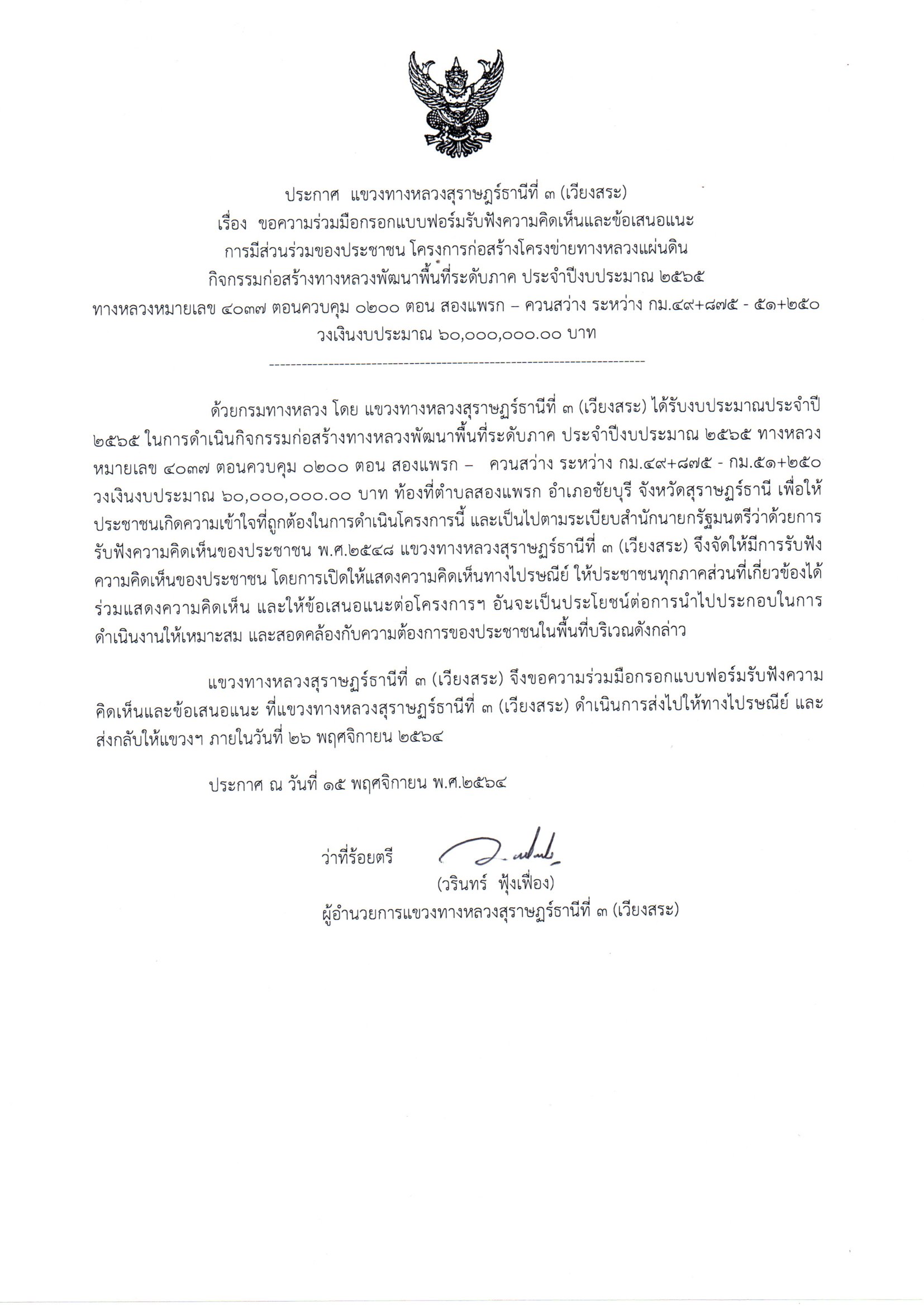 แขวงทางหลวงสุราษฏร์ธานีที่ 3 (เวียงสระ) โดย ว่าที่ร้อยตรีวรินทร์ ฟุ้งเฟื่อง ผู้อำนวยการแขวงทางหลวงสุราษฏร์ธานีที่ 3 (เวียงสระ) จะดำเนินการรับฟังความคิดเห็นของประชาชนในโครงการการมีส่วนร่วมของประชาชนทางไปรษณีย์ ระหว่างวันที่ 16 พฤศจิกายน 2564 – วันที่ 26 พฤศจิกายน 2564 โครงการก่อสร้างโครงข่ายทางหลวงแผ่นดิน กิจกรรมก่อสร้างทางหลวงพัฒนาพื้นที่ระดับภาค ประจำปีงบประมาณ 2565 ทางหลวงหมายเลข 4037 ตอนควบคุม 0200 ตอน สองแพรก – ควนสว่าง ระหว่าง กม.49+875 - กม.51+250 วงเงินงบประมาณ 60,000,000.00 บาท ท้องที่ตำบลสองแพรก อำเภอชัยบุรี จังหวัดสุราษฏร์ธานี