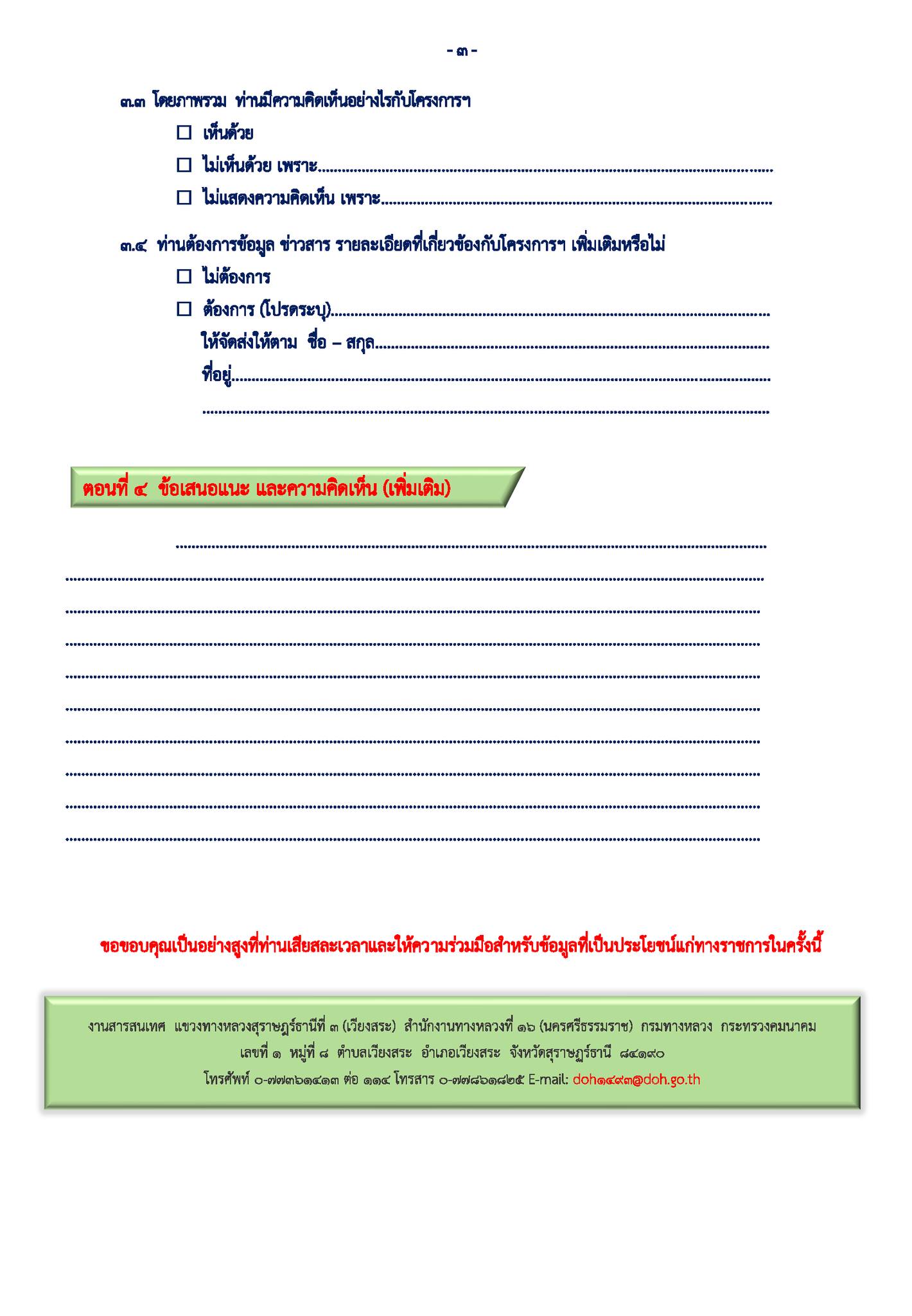 การรับฟังความคิดเห็นของประชาชนในโครงการการมีส่วนร่วมของประชาชนทางไปรษณีย์ ระหว่างวันที่ 25 กรกฏาคม 2565 – วันที่ 8 สิงหาคม 2565 โครงการก่อสร้างโครงข่ายทางหลวงแผ่นดิน กิจกรรมก่อสร้างเพิ่มประสิทธิภาพทางหลวง ประจำปีงบประมาณ 2566 ทางหลวงหมายเลข 4009 ตอนควบคุม 0203 ตอน บางสวรรค์ – บางหล่อ ระหว่าง กม.110+495 - กม.111+750