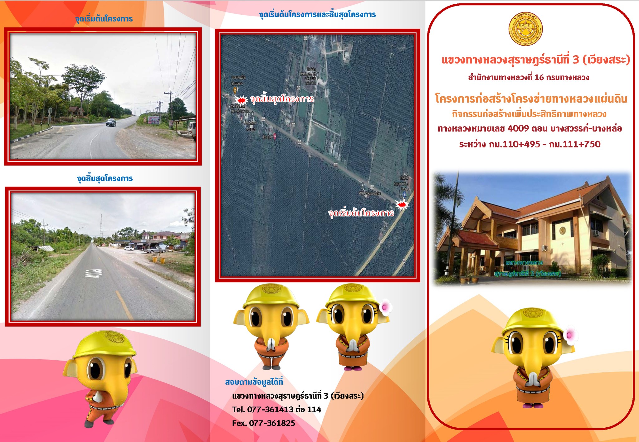 แขวงทางหลวงสุราษฏร์ธานีที่ 3 (เวียงสระ) โดย ว่าที่ร้อยตรีวรินทร์ ฟุ้งเฟื่อง ผู้อำนวยการแขวงทางหลวงสุราษฏร์ธานีที่ 3 (เวียงสระ) จะดำเนินการรับฟังความคิดเห็นของประชาชนในโครงการการมีส่วนร่วมของประชาชนทางไปรษณีย์ ระหว่างวันที่ 25 กรกฏาคม 2565 – วันที่ 8 สิงหาคม 2565 โครงการก่อสร้างโครงข่ายทางหลวงแผ่นดิน กิจกรรมก่อสร้างเพิ่มประสิทธิภาพทางหลวง ประจำปีงบประมาณ 2566 ทางหลวงหมายเลข 4009 ตอนควบคุม 0203 ตอน บางสวรรค์ – บางหล่อ ระหว่าง กม.110+495 - กม.111+750 วงเงินงบประมาณ 30,000,000.00 บาท ท้องที่ตำบลบางสวรรค์ อำเภอพระแสง จังหวัดสุราษฏร์ธานี