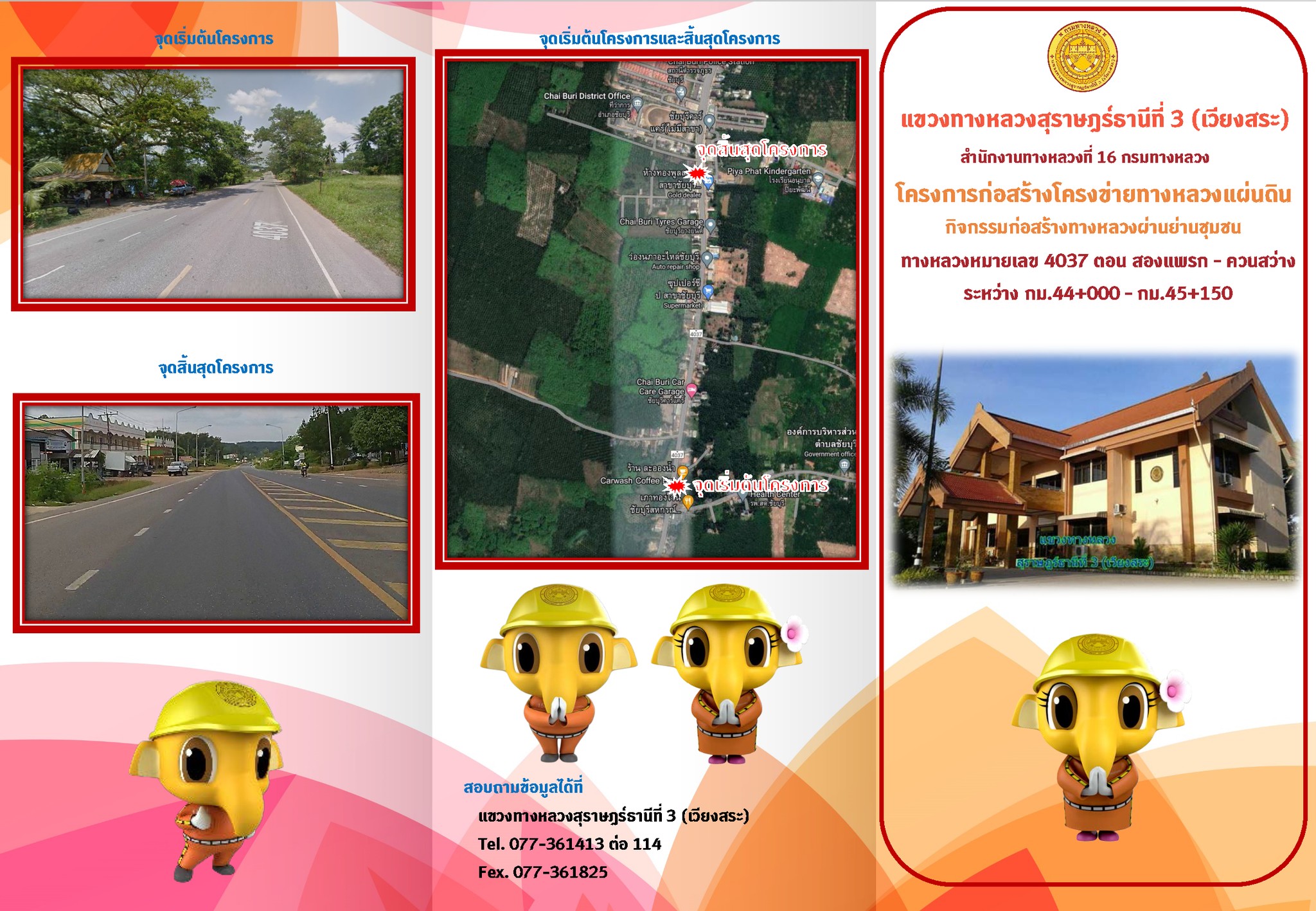 แขวงทางหลวงสุราษฏร์ธานีที่ 3 (เวียงสระ) โดย ว่าที่ร้อยตรีวรินทร์ ฟุ้งเฟื่อง ผู้อำนวยการแขวงทางหลวงสุราษฏร์ธานีที่ 3 (เวียงสระ) จะดำเนินการรับฟังความคิดเห็นของประชาชนในโครงการการมีส่วนร่วมของประชาชนทางไปรษณีย์ ระหว่างวันที่ 25 กรกฏาคม 2565 – วันที่ 8 สิงหาคม 2565 โครงการก่อสร้างโครงข่ายทางหลวงแผ่นดิน กิจกรรมก่อสร้างทางหลวงผ่านย่านชุมชน ประจำปีงบประมาณ 2566 ทางหลวงหมายเลข 4037 ตอนควบคุม 0200 ตอน บางสวรรค์ – บางหล่อ ระหว่าง กม.44+000 – กม.45+150 วงเงินงบประมาณ 40,000,000.00 บาท ท้องที่ตำบลไทรทอง อำเภอชัยบุรี จังหวัดสุราษฏร์ธานี