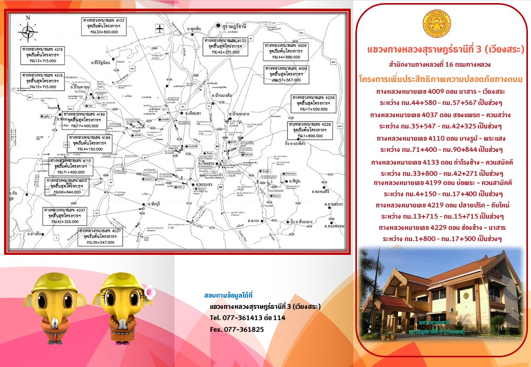 แขวงทางหลวงสุราษฏร์ธานีที่ 3 (เวียงสระ) โดย ว่าที่ร้อยตรีวรินทร์ ฟุ้งเฟื่อง ผู้อำนวยการแขวงทางหลวงสุราษฏร์ธานีที่ 3 (เวียงสระ) จะดำเนินการรับฟังความคิดเห็นของประชาชนในโครงการการมีส่วนร่วมของประชาชนทางไปรษณีย์ ระหว่างวันที่ 1 กันยายน 2565 – วันที่ 26 กันยายน 2565 โครงการเพิ่มประสิทธิภาพความปลอดภัยทางถนน ทางหลวงหมายเลข 4009 ตอน นาสาร–เวียงสระ ระหว่าง กม.44+580–กม.57+567 เป็นช่วง ๆ อ.บ้านนาสารและ อ.เวียงสระ, ทางหลวงหมายเลข 4037 ตอน สองแพรก–ควนสว่าง ระหว่าง กม.35+547–กม.42+325 เป็นช่วง ๆ อ.ชัยบุรี, ทางหลวงหมายเลข 4110 ตอน บางรูป–พระแสง ระหว่าง กม.71+400–กม.90+844 เป็นช่วง ๆ อ.พระแสง, ทางหลวงหมายเลข 4133 ตอน ท่าโรงช้าง–ควนสามัคคี ระหว่าง กม.33+800–กม.42+271 เป็นช่วง ๆ อ.เคียนซา, ทางหลวงหมายเลข 4199 ตอน บ่อพระ–ควนสามัคคี ระหว่าง กม.4+150–กม.17+400 เป็นช่วง ๆ อ.เคียนซา, ทางหลวงหมายเลข 4219 ตอน ปลายหลิก–ทับใหม่ ระหว่าง กม.13+715–กม.15+715 เป็นช่วง ๆ อ.เคียนซา, ทางหลวงหมายเลข 4229 ตอน ช่องช้าง–นาสาร ระหว่าง กม.1+800–กม.17+500 เป็นช่วง ๆ อ.บ้านนาสารโครงการปรับปรุงถนนสายช่องช้าง-นาสาร ทางหลวงหมายเลข 4229 ตอน ช่องช้าง – นาสาร ระหว่าง กม.3+250 – กม.14+600 ระยะทาง 10.350 กม.วงเงินงบประมาณ 50,000,000.00 บาท